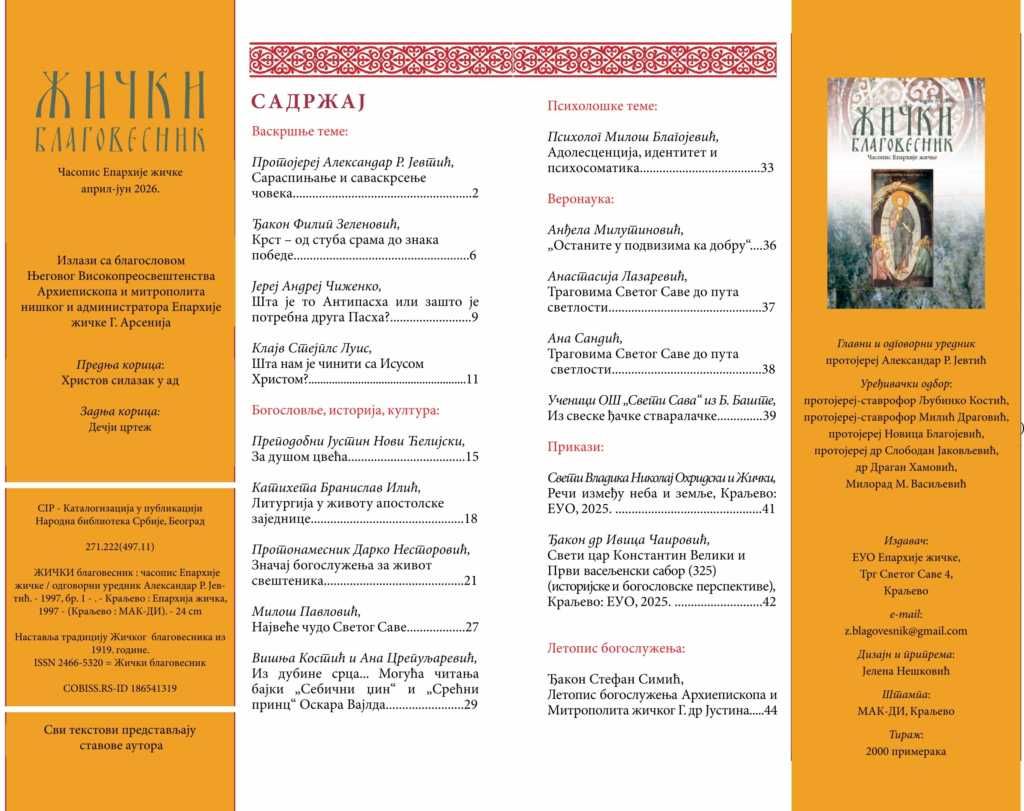 Са благословом Његовог Високопреосвештенства Митрополита нишког и администратора Епархије жичке Г. Арсенија из штампе је изашао нови број Жичког благовесника (април-јун 2026).
