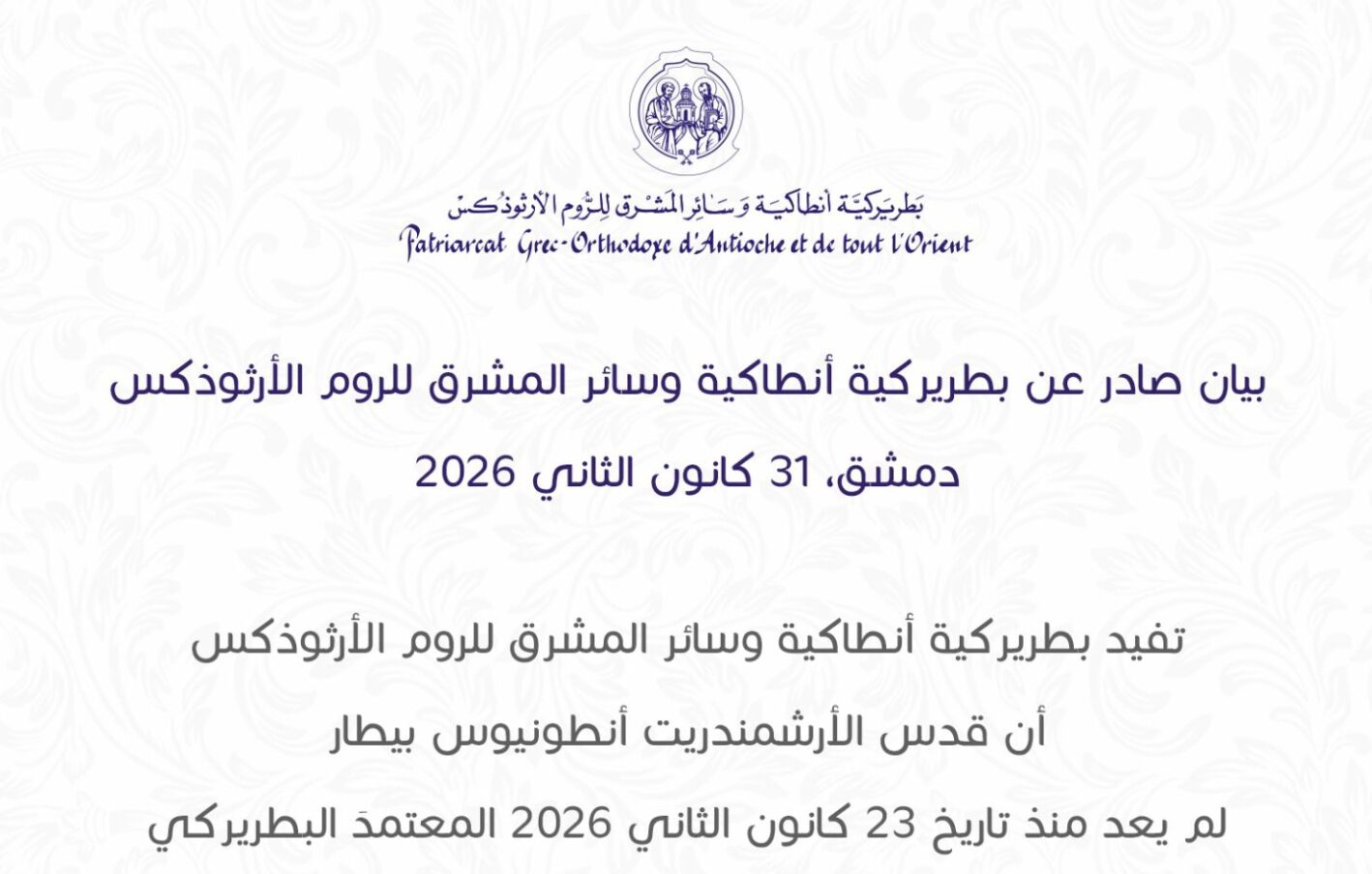 Према саопштењу, пречасни архимандрит Антониос Беитар престао је да служи као патријарашки представник у Викаријату Шведске и Скандинавије од 23. јануара 2026. године. Он ће наставити своју свештеничку службу у Архиепископији Триполи, Кура и њиховим зависним подручјима.