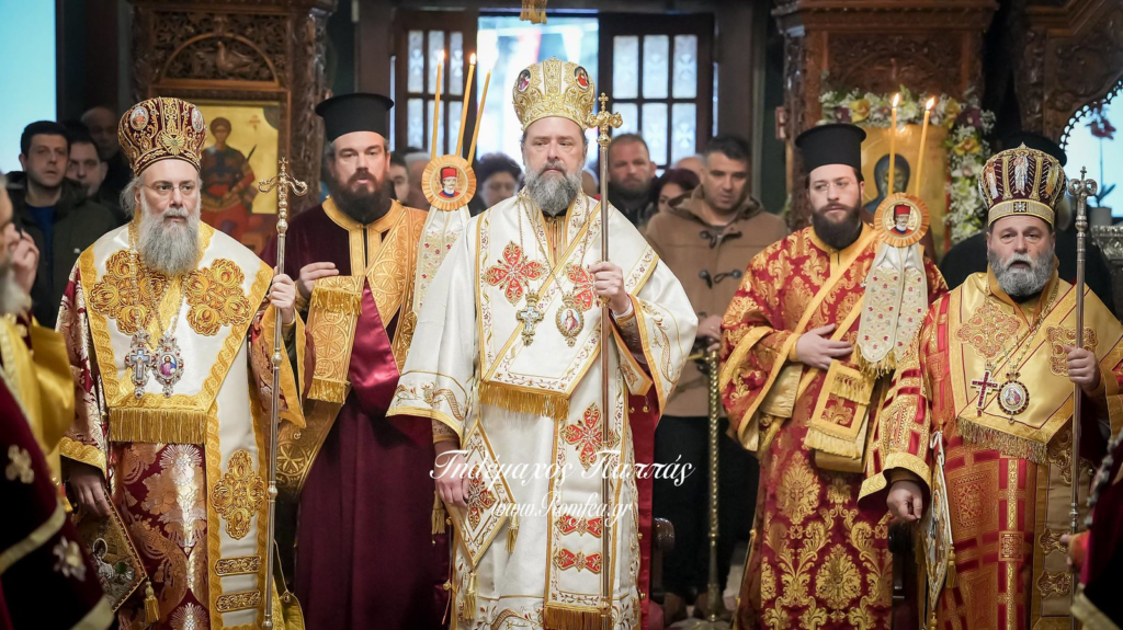 У поклоничком храму Светог Георгија служено је торжествено саборно архијерејско богослужење, којим је началствовао Његово Високопреосвештенство митрополит солунски Филотеј, уз саслужење Њихових Високопреосвештенстава митрополита трикског Хризостома и надлежног архијереја, митрополита јањинског Максима.