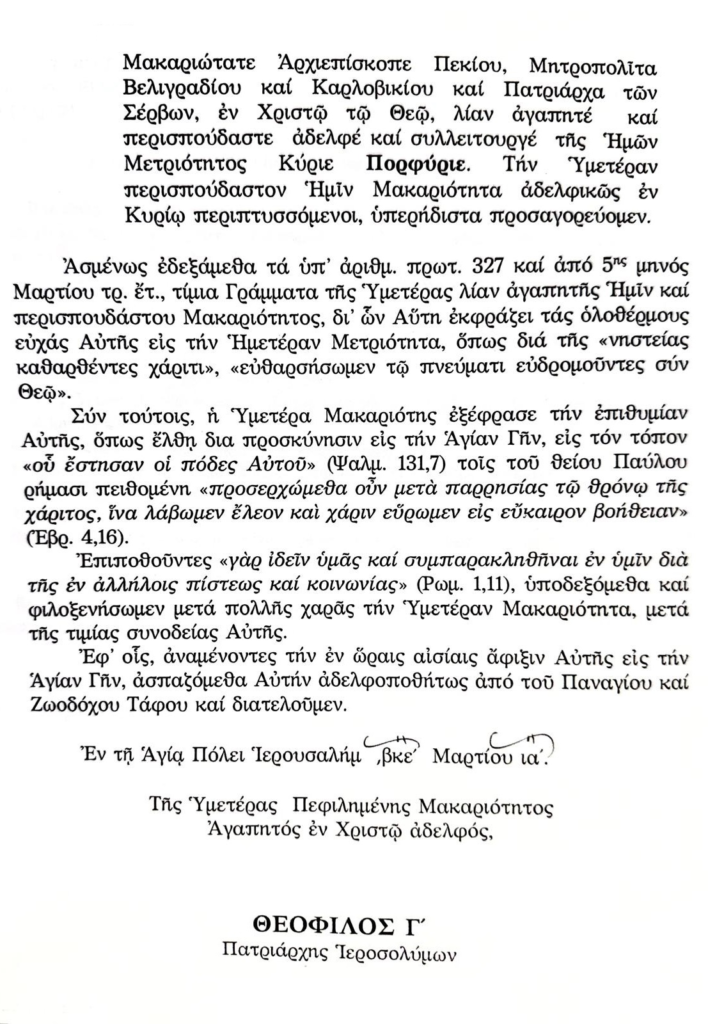 На сајту Јерусалимске патријаршије објављено је писмо одговора којим се Патријарх Теофило обратио Патријарху српском Порфирију. Текст писма доносимо у целости: