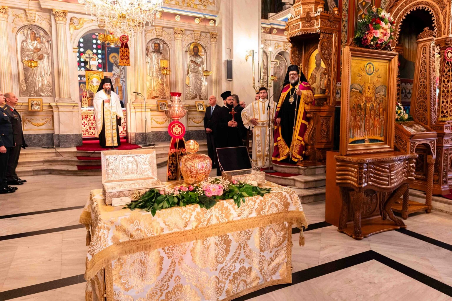 Његово Преосвештенство пратили су протосинкел Свете Митрополије Месиније, архимандрит Филип Хамаргија, и парохијски свештеници града Каламате, док су места за појање красила два хора Митрополијског храма Ваведења Христовог у Каламати, под управом протопсалтиса г. Константиноса Сијахоса и лампадара г. Петроса Ставроса.