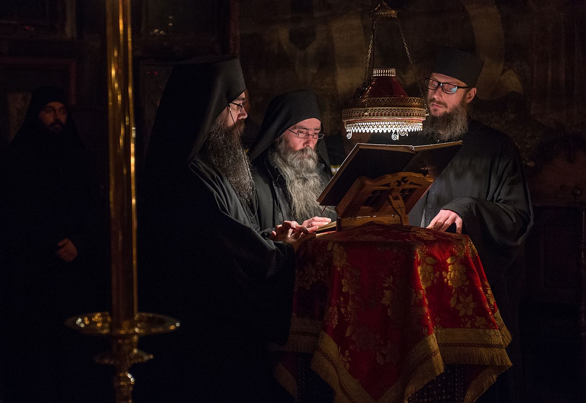 А монасима (заповеђено је) јести рибу само на Благовести, (а) уље и вино само у суботу и у Недељу. Осталим данима, монаси, у овом Посту, почевши од Недеље Православља, једу сухоједење пет дана сваке седмице, као што је речено, и једампут на дан. У понедељак, среду и петак – само хлеб и воду и оно што је квашено и сирово, ако се нађе. У уторак, пак и у четвртак, ако се и догоди кувано учинити, али да буде „сухотно“3. И тако, до суботе Светог Лазара и Недеље Цвети, иноци да држе, да у девети час, по отпевању (завршетку) вечерњег богослужења, једу у све дане речене, осим нужде, које се могу догодити, (а и тада) ипак, са расуђивањем духовника.
