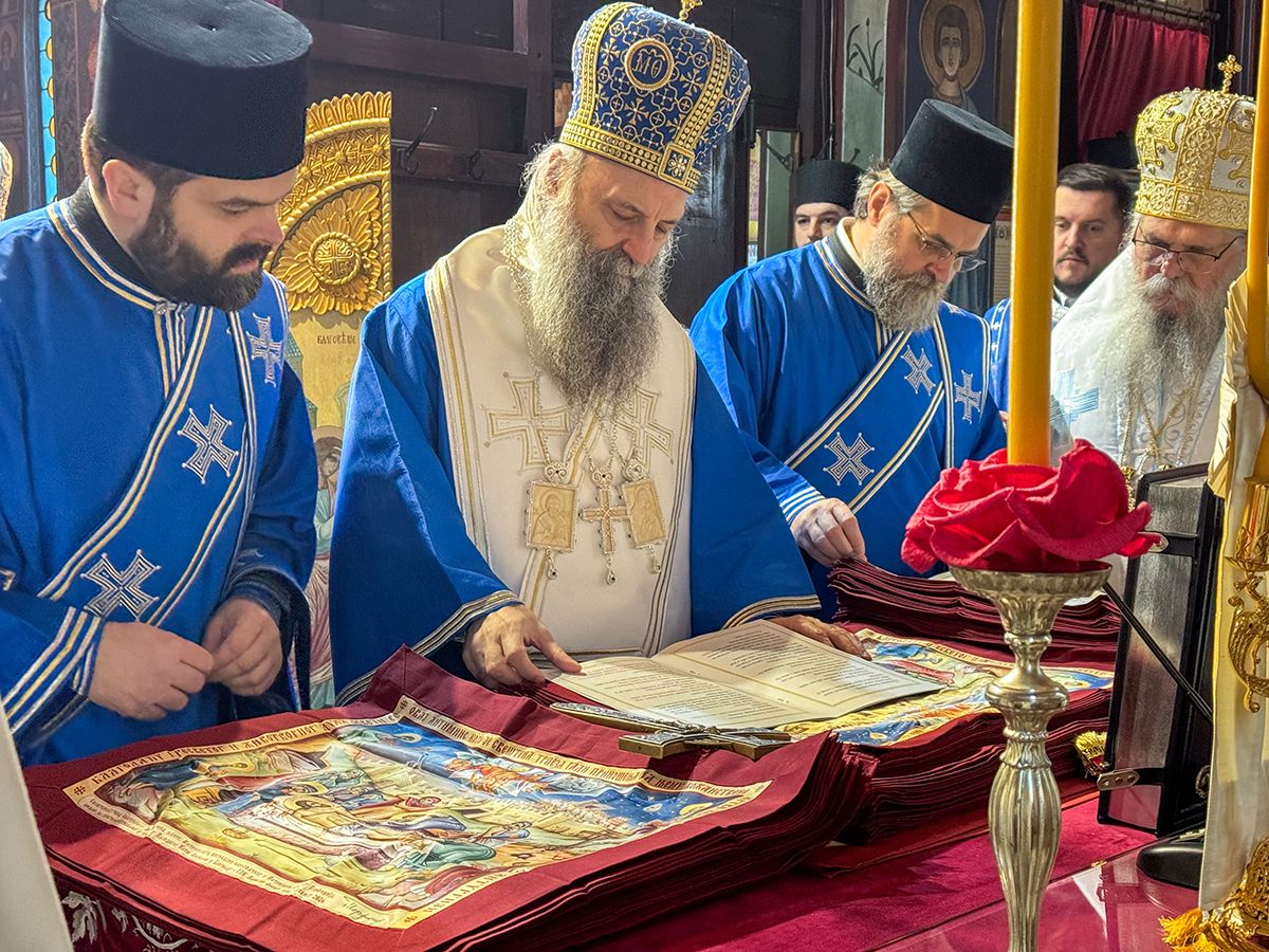 Појашњавајући верном народу свештени чин који је обављен на почетку свете Литургије, Светејши Патријарх је подсетио да се у раној Цркви света Литургија служила на местима где су страдали мученици или на моштима пострадалих за Христа. – И до наших дана је остало да свету Литургију служимо на моштима светитеља, тако што на свакој Часној трпези стоји антиминс са честицом моштију неког светитеља. Обичај је да се антиминси освећују када у епархију дође нови епископ, који је изабран Сабором и који је признат код свих помесних Православних Цркава, па стога антиминс јесте гарант православности, тј. црквености сабрања које служи свету Литургију – поручио је патријарх Порфирије.