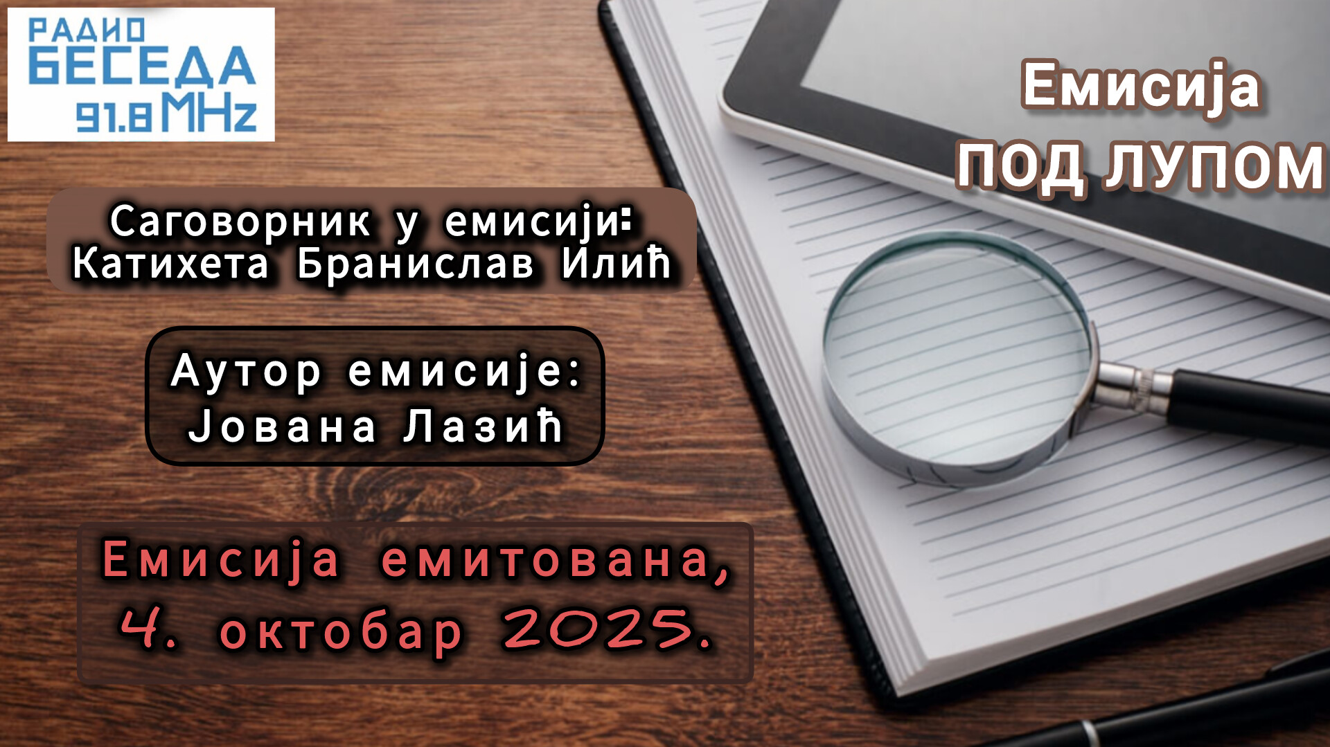 Саговорник у емисији Радио-Беседе „Под лупом“, 4. октобра 2025. године био је новосадски катихета Бранислав Илић.