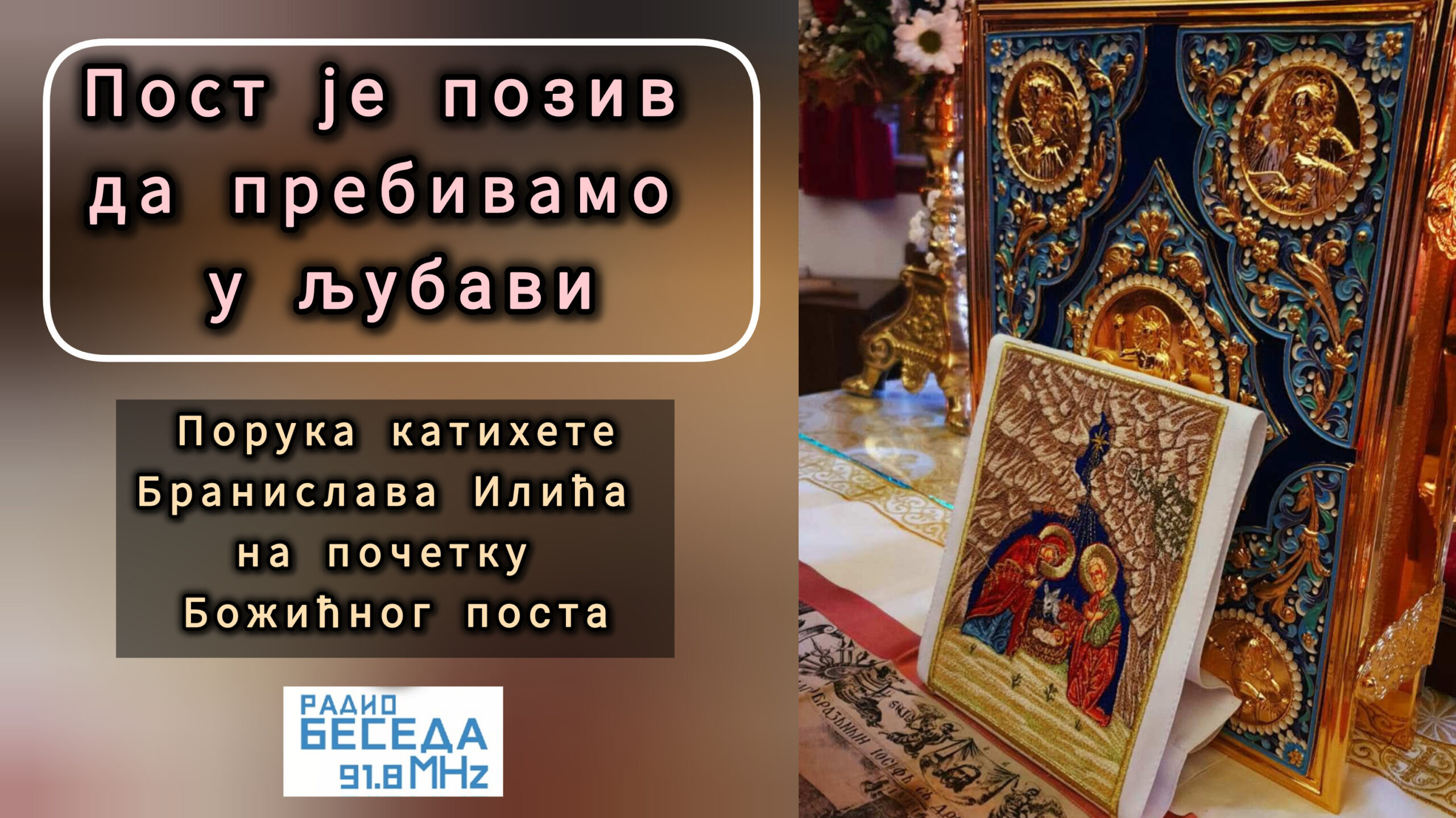 „Налазимо се на почетку Божићне четрдесетнице – Божићног поста, наша овонедељна емисија је саображена са почетком нашег духовног хода ка празнику Рождества Христова. Прилика је да нашој браћи и сестрама пожелимо да се добрим подвигом подвизавају у овим благословеним данима, да се потрудимо сви заједно да припремимо дом своје душе за Богомладенца Христа, да се за празник у којем прослављамо Оваплоћење Господа нашег Исуса Христа Очовеченог Логоса, наоружамо врлинама како бисмо на достојан начин заједно са анђелима величали и узносили вечну песму Господу нашем, речима анђелске химне: Слава на висини Богу, а на земљи мир, међу људима добра воља. Ова ангелска песма нас упућује да будемо загледани у догађај који нам предстоји – празник јављања Господњег. Богу хвала, на овај наш духовни пут поста закорачили смо молитвено и измирени једни са другима. Пост је радост душе, а пост је и прилика да љубав сведочимо једни са другима, да се радујемо једни другима, али и да у овим подвизима подржавамо једни друге. Призвани смо да онима који су жељни пажње – пружимо пажњу, да онима којима је потребна помоћ – пружимо помоћ, да онима жалоснима – пружимо реч утехе, а да увек и свима будемо они који раширеним срцем грле христоликом љубављу свакога човека. Љубав је мера нашега достојанства, љубав је темељ нашег битисања, љубав је корен свеколиког нашег живота. Управо у таквој љубави налазимо смисао, јер према речима светог апостола и јеванђелисте Јована Богослова: Бог је Љубав, ко пребива у Љубави, пребива у Богу“, рекао је катихета Бранислав Илић.