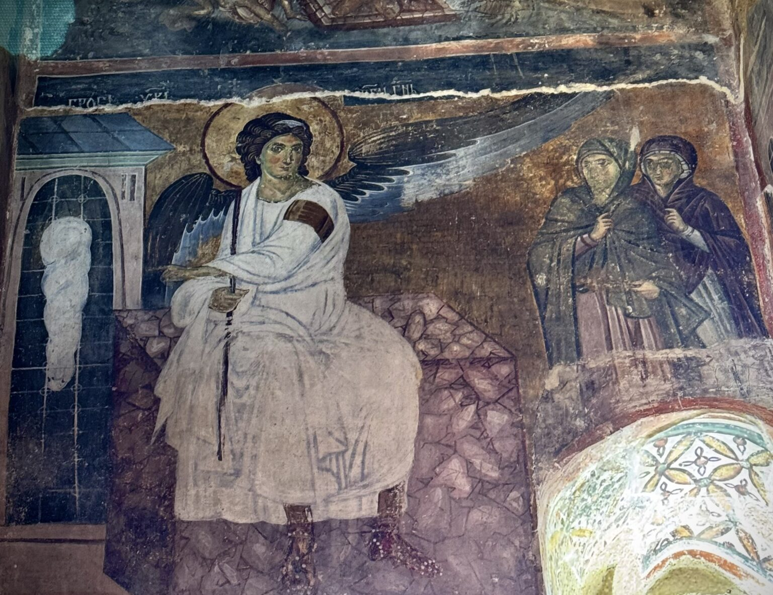Вековима скривана испод слоја фресака које су је прикриле, остала је сачувана у тишини и мраку и када је откривена постала је запажена и окарактерисана као врхунац овог сликарског правца. Анђео, насликан како седи на камену у белим одеждама, руком показује на Гроб Господњи који је празан и у коме је остала само плаштаница, тиме поручујући да је Христос међу живима. У центру ове композиције је Анђео, изражене лепоте и сталоженог лика. Он се обраћа женама мироносицама које су дошле на Христов гроб, а оне у њега гледају са чуђењем, док испод њих леже поспали војници, недостојни да сведоче Васкрсењу.